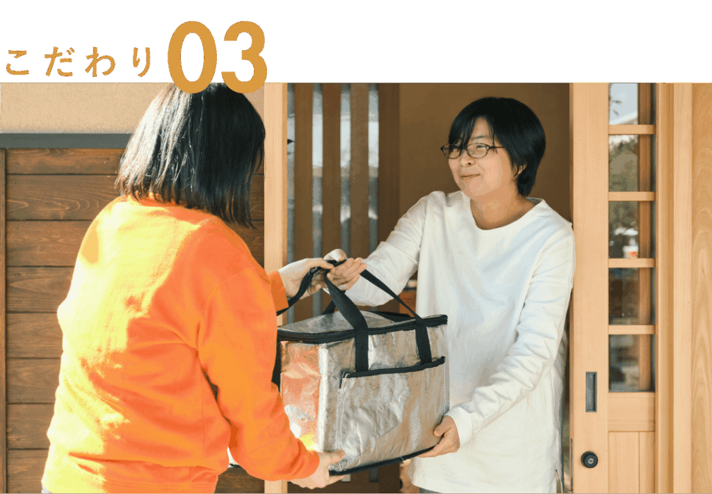 お客様のお好みやライフステージの変化に合わせて、ご提案もさせていただきます。お客様との会話をヒントに、業務改善や新サービス開始のきっかけにすることもあります。ごはんの配達だけではなく、いつでも頼りにしてもらえる存在でいたい、と私たちは考えています。